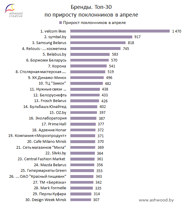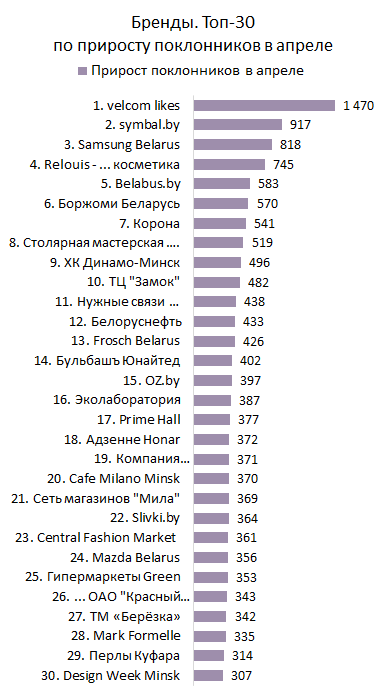 БРЕНДЫ. Топ-30 по приросту поклонников за апрель