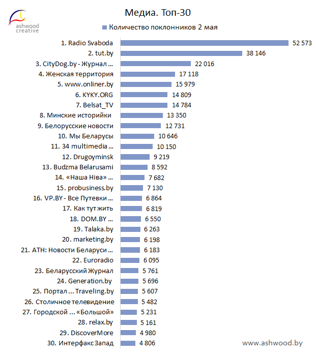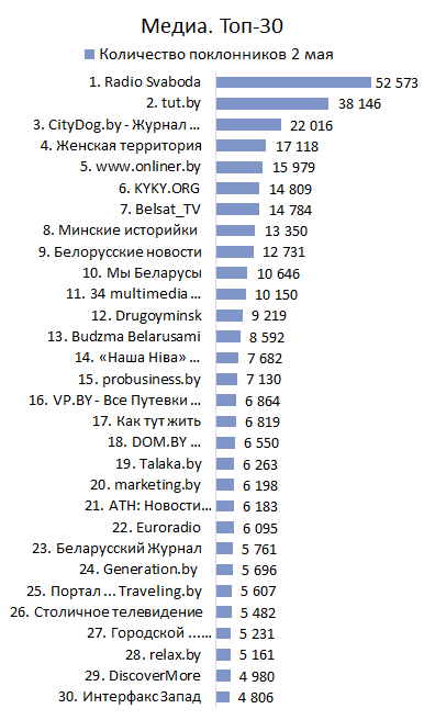 «Radio Svaboda» четвертый месяц подряд занимает первую строку Топа по приросту за месяц. Страницу «tut.by», занимавшую второе место три месяца подряд, сместили на четвертое «probusiness.by» и «Belsat_TV», которые заняли второе и третье места соответственно.