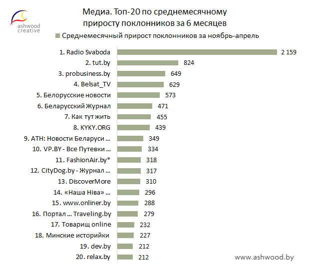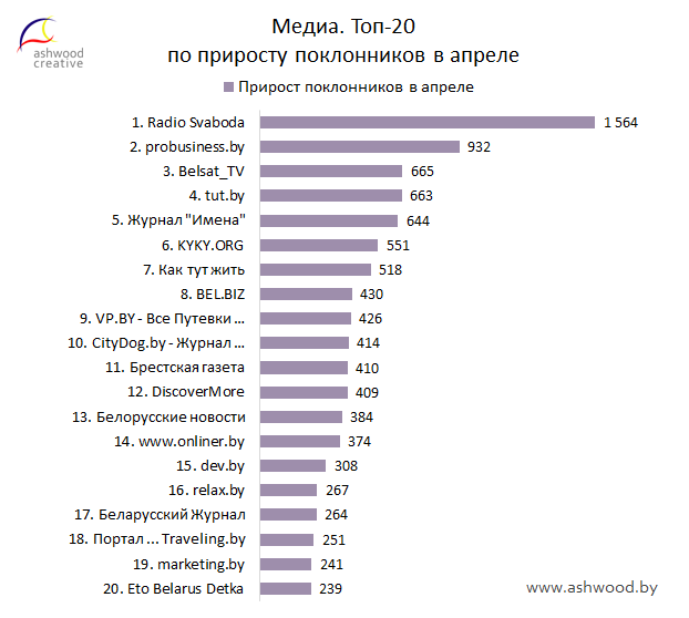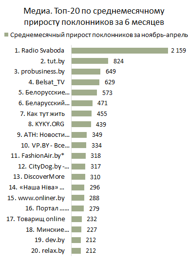 МЕДИА. Топ-20 по приросту поклонников за апрель