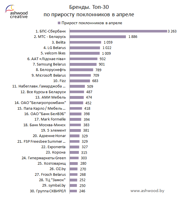 Топ по приросту поклонников за месяц обновился на треть. Первая тройка полностью сменилась. Лидером апреля стала страница «БПС-Сбербанк» с результатом 3 263 поклонника. На втором месте расположился «МТС - Беларусь». Третье место досталось «Belita».