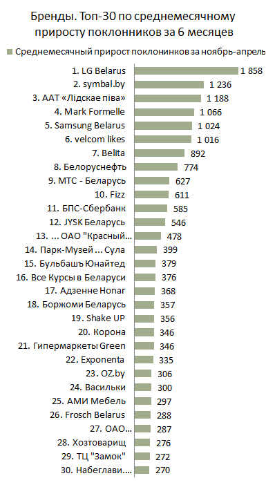 БРЕНДЫ. Топ-30 по приросту поклонников за апрель