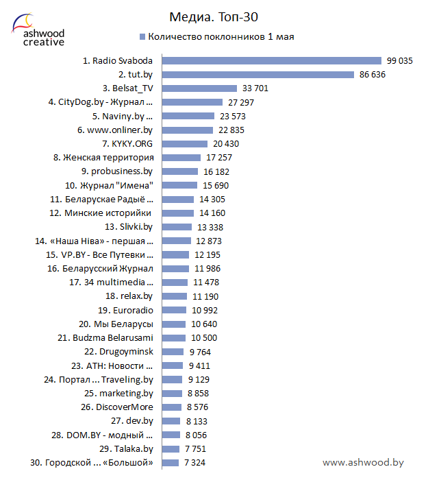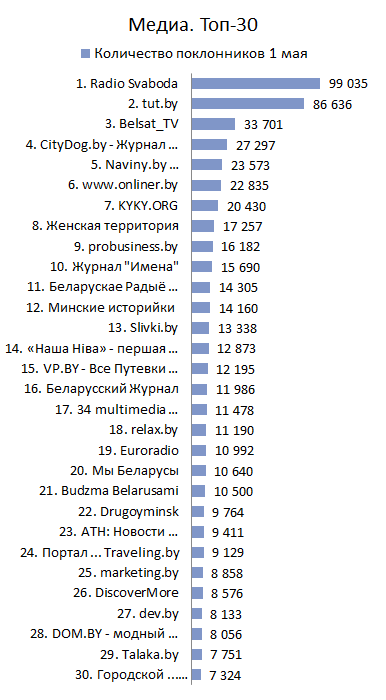 Топ-30 Медиа по количеству поклонников не претерпел значительных изменений. Как и прежде два лидера «Radio Svaboda» и «tut.by» возглавляют рейтинг Медиа с большим отрывом от остальных страниц.