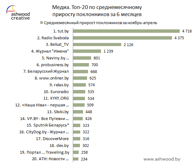 МЕДИА. Топ-20 по приросту поклонников за апрель