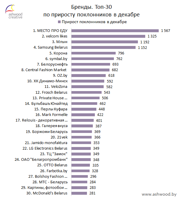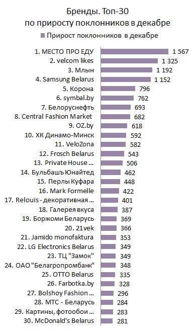 БРЕНДЫ. Топ-30 по приросту поклонников за декабрь