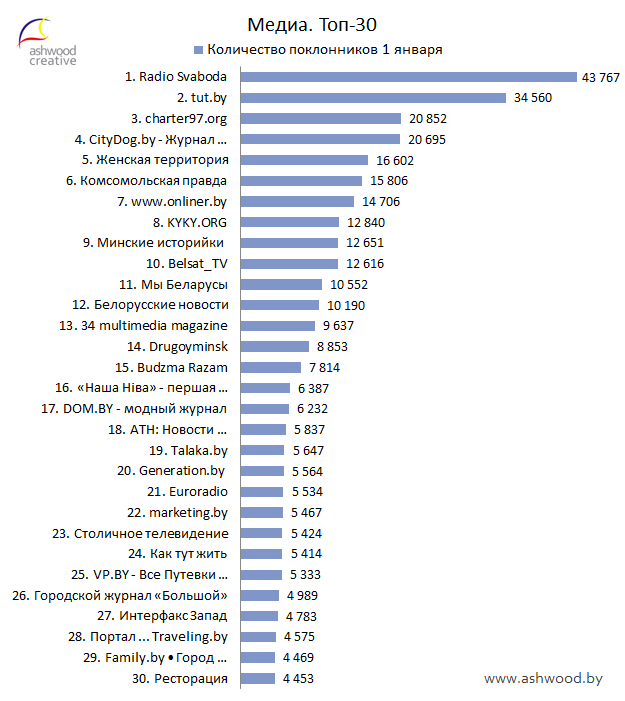 В Топ-30 Медиа по количеству поклонников в последнее время редко происходили какие-либо изменения. Однако в этот раз сразу три страницы покинули Топ: «Vandrouki.by», «I Love Minsk» и «Tribuna.com Беларусь». Их места в Топе заняли «Белорусские новости», «Портал путешествий Traveling.by» и «Family.by • Город для детей».