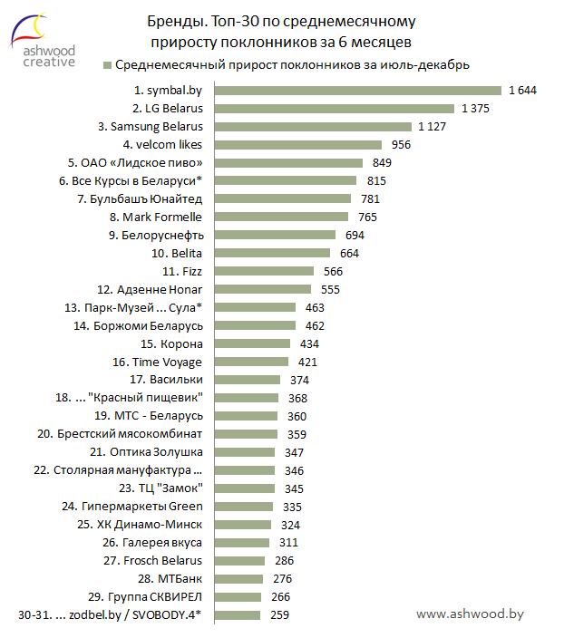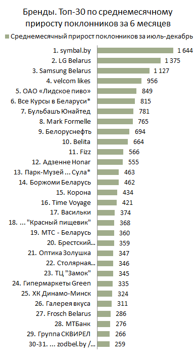 Показатель прироста за месяц — это хорошо, но взгляд на динамику этого показателя за полугодие позволит нам оценить результативность продвижения страниц более объективно. Больший период наблюдений позволяет нивелировать фактор сроков ведения страниц, который влияет на распределение страниц в рейтинге по количеству поклонников, и фактор краткосрочных взлетов и провалов, который влияет на рейтинг по приросту за месяц. Топ-30 брендов по среднемесячному приросту поклонников за полгода выглядит так: