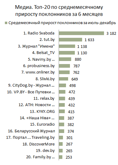 Страница «Radio Svaboda», пять месяцев подряд занимавшая первую строку Топ-30 Медиа по приросту за месяц, переместилась на шестое место, уступив место лидера своему неформальному сопернику по рейтингу – странице «tut.by». Второе и третье места соответственно заняли «Журнал "Имена"» и «www.onliner.by».