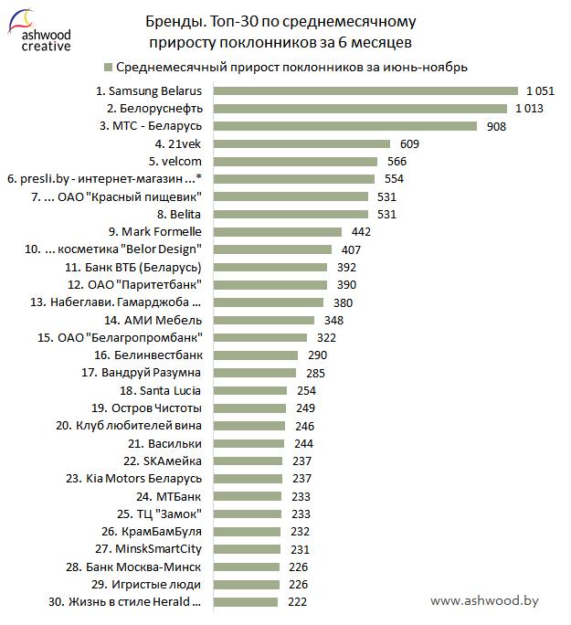 • В ноябре особая активность отмечалась на странице «presli.by - интернет-магазин модной одежды». Ей удалось стать лидером Топа приросту поклонников и войти в Топ по среднемесячному приросту за полугодие, расположившись в нем на 6 строчке.