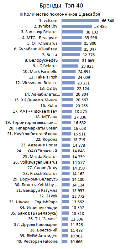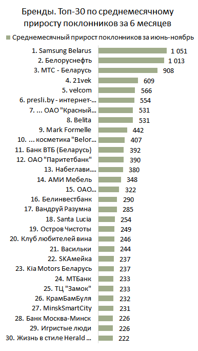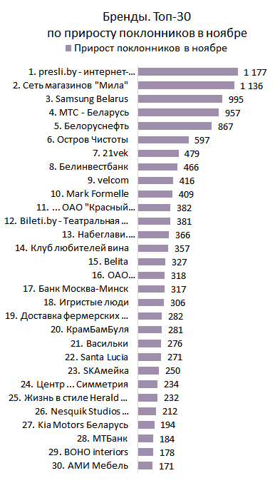 • Как и прогнозировалось в прошлом месяце странице «МТС-Беларусь» удалось приблизиться к тройке лидеров Топа по количеству поклонников и занять 4 строку в рейтинге за ноябрь.