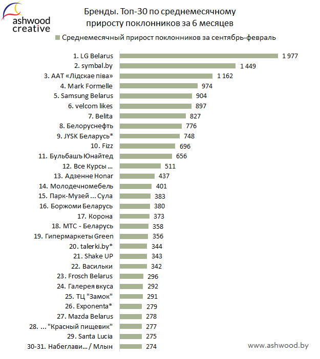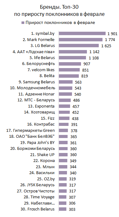 Четыре месяца подряд лидером по приросту становилась страница «LG Belarus». В феврале же она заняла третье место, уступив лидерство «symbal.by». На втором месте расположился «Mark Formelle».