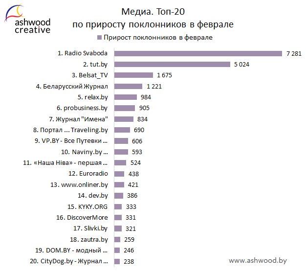 МЕДИА. Топ-20 по приросту поклонников за февраль