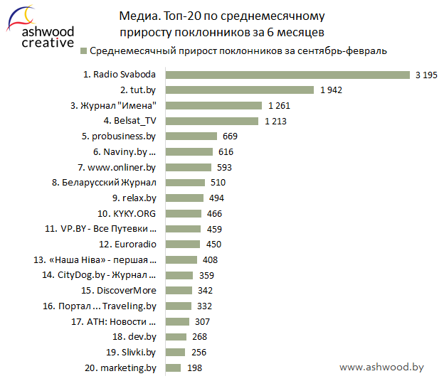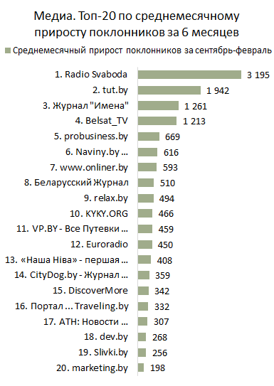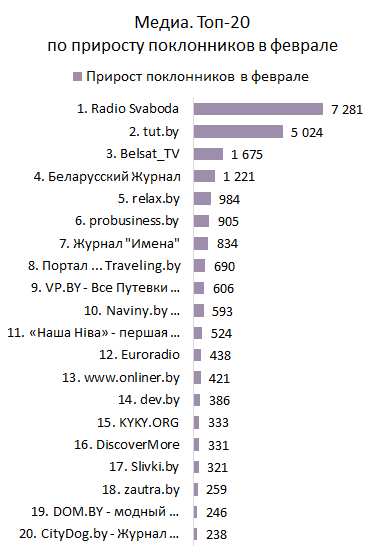 - В феврале установлен рекорд по суммарному количеству поклонников Топа-20 Медиа по приросту за месяц — 23 310. Такой успех достигнут благодаря странице «Radio Svaboda», прирост поклонников которой за февраль составил 7 281. Это второй наилучший показатель прироста после рекорда «tut.by».