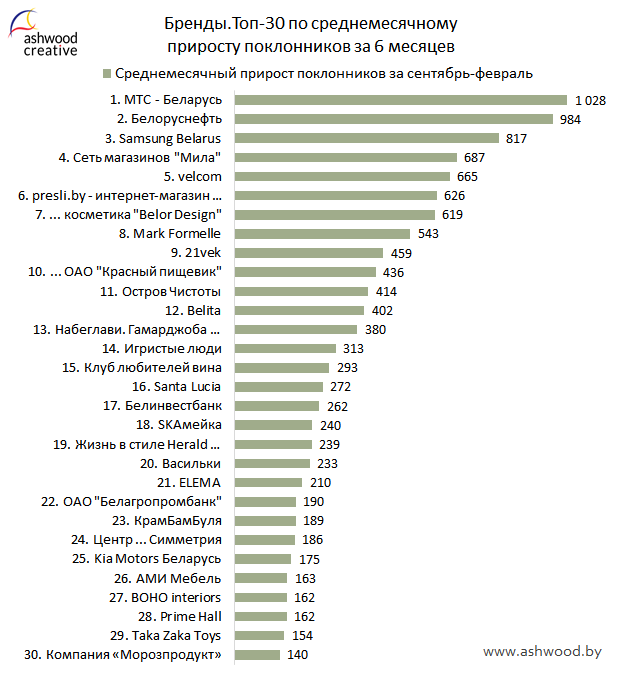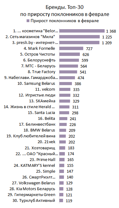 БРЕНДЫ. Топ-30 по приросту поклонников за февраль