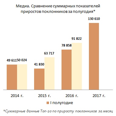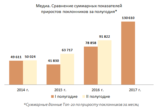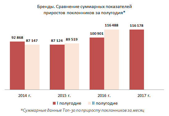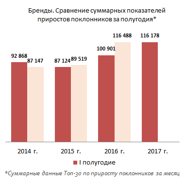 Подводя итоги первого полугодия 2017 года, можно отметить, что это время было очень плодотворным для страниц Медиа. Их суммарный прирост почти в 1,5 раза выше, нежели во втором полугодии 2016-го. Результаты Брендов в целом неплохие – на уровне второго полугодия 2016 года. Но по сравнению с Медиа они выглядят достаточно блекло. Надеемся, что вторая половина будет более удачной для Брендов!