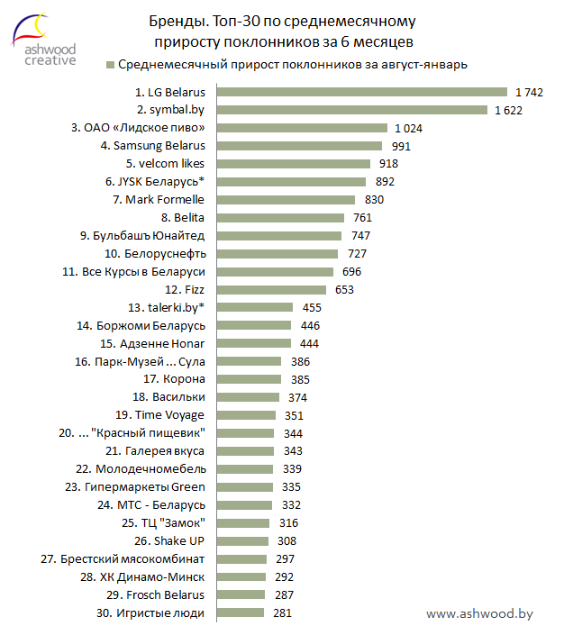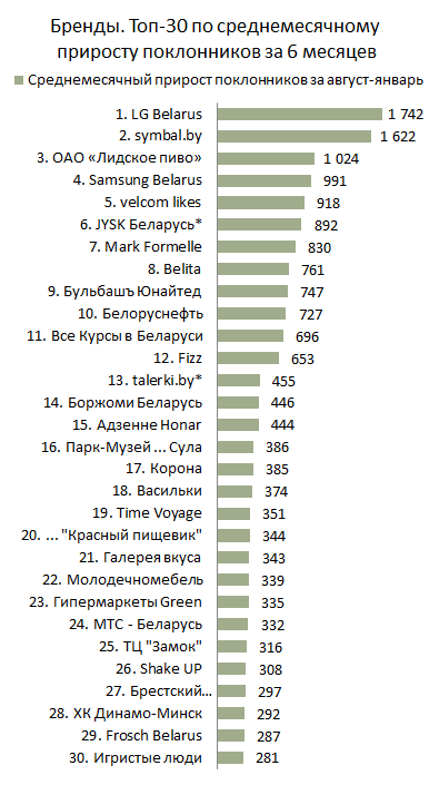 Взгляд на среднемесячный прирост за полугодие позволяет оценить результативность продвижения страниц более объективно. Ограниченный 6 месяцами период позволяет нивелировать фактор сроков ведения страниц, который влияет на распределение страниц в рейтинге по количеству поклонников, и фактор краткосрочных взлетов и провалов, который влияет на рейтинг по приросту за месяц. Топ-30 брендов по среднемесячному приросту поклонников за полгода выглядит так: