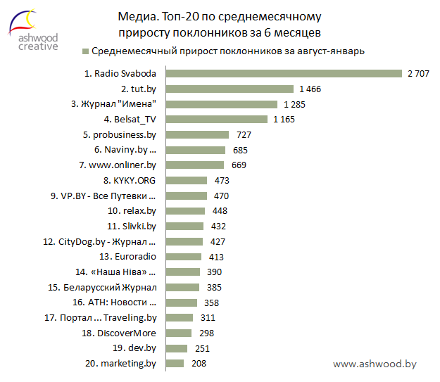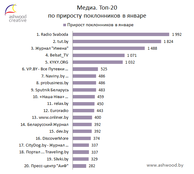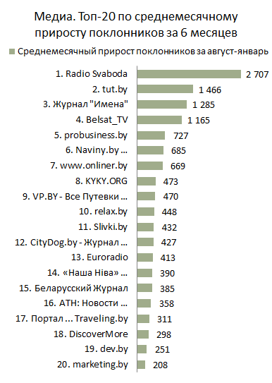 В Топ-30 Медиа вошла страница «Беларускае Радыё Рацыя», заняв сразу девятое место. Страница «Family.by • Город для детей», соответственно, покинула Топ. В остальном значительных изменений в Топе не произошло. Страницы «Radio Svaboda» и «tut.by» по-прежнему занимают первое и второе места соответственно. На третьем с большим отрывом располагается «CityDog.by - Журнал о Минске».