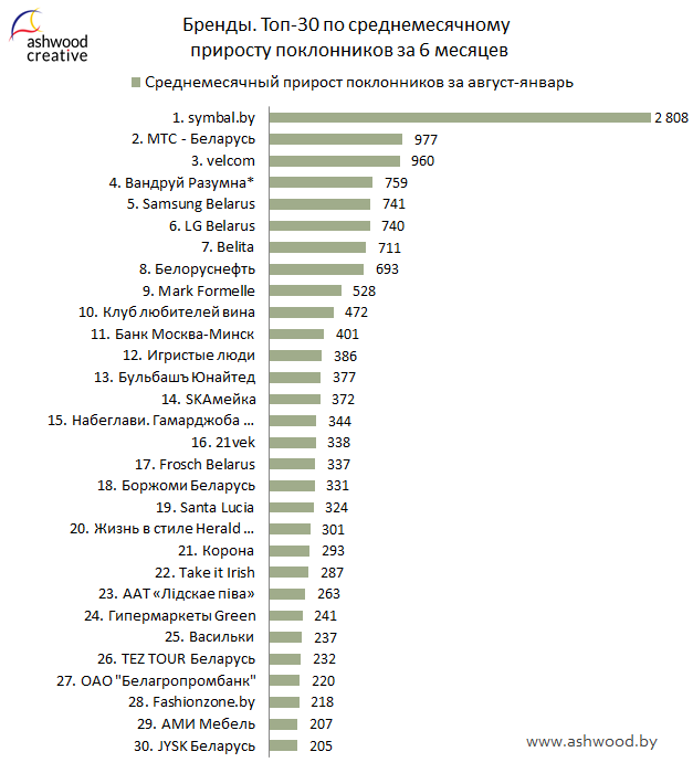 Безоговорочным лидером по среднемесячному приросту за полугодие оказалась страница symbal.by, к слову, она единственная из списка участников рейтинга в среднем, набирала более двух тысяч поклонников. Также в ТОП Брендов вошли три новые страницы. Страница «Вандруй Разумна» приблизилась к тройке лидеров, заняв 4-ую позицию. «Клуб любителей вина» и «TEZ TOUR Беларусь» расположились на 10 и 26 местах соответственно.