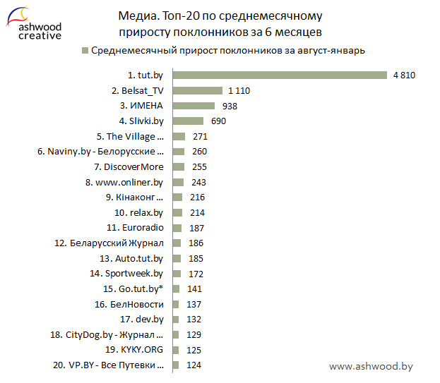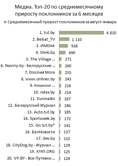 Благодаря «tut.by» суммарный прирост поклонников Топа Медиа вырос в два раза по сравнению с предыдущим месяцем и составил 19 927.