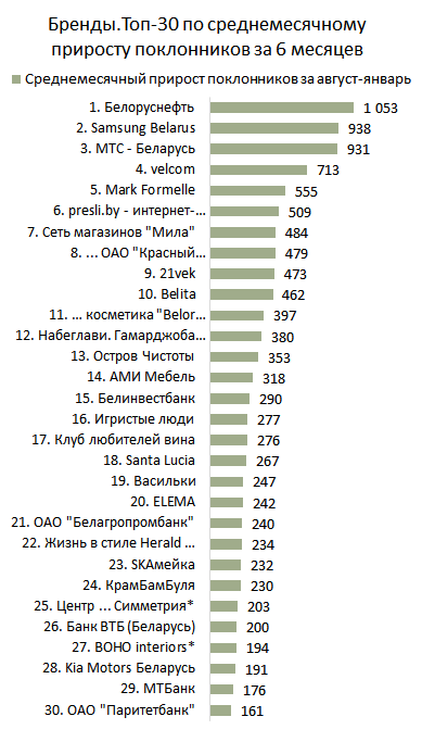В тройке лидеров Топа по среднемесячному приросту произошли изменения: страница «Белоруснефть» вытеснила «Samsung Belarus» на вторую строчку, заняв место лидера. На третьем месте по-прежнему располагается «МТС - Беларусь».