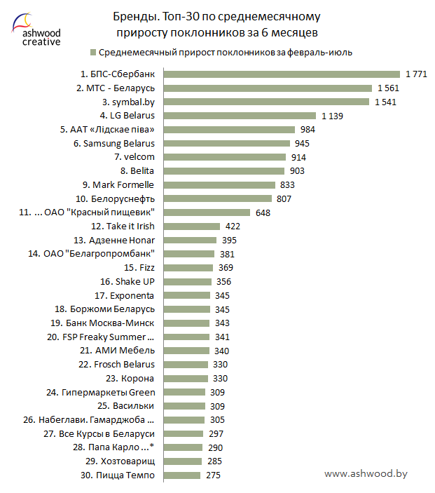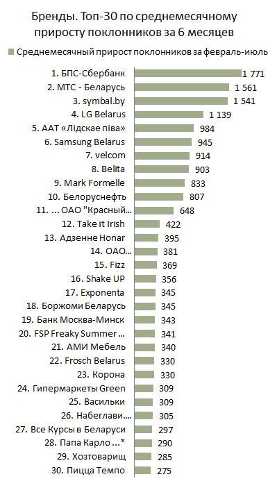 • Страница «symbal.by» стала лидером Топ-30 по среднемесячному приросту поклонников за 6 месяцев. Напомним, что на протяжении полугода эту позицию занимала «LG Belarus», которая в этот раз опустилась на 2 место;