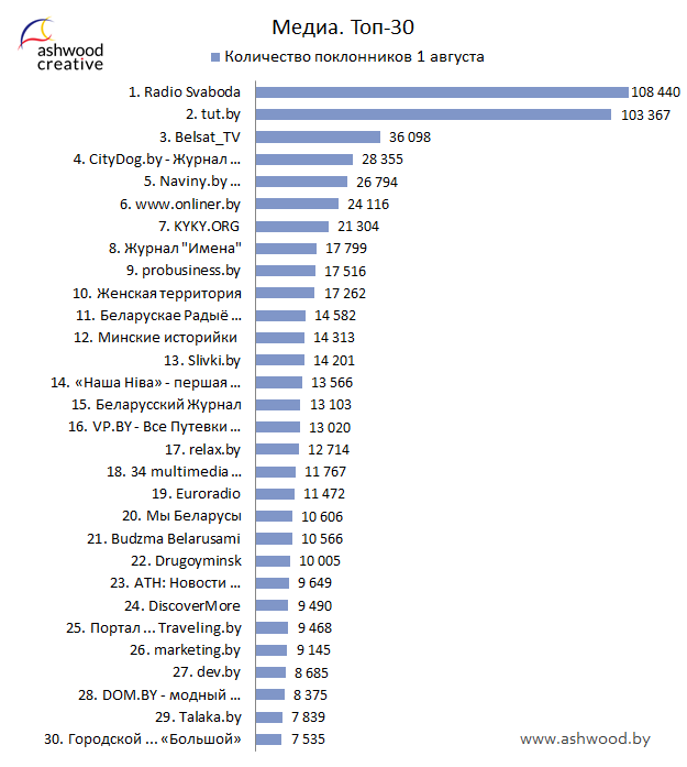 Хорошие новости! Теперь в нашем рейтинге есть уже две страницы, перешедшие рубеж в 100 тысяч поклонников. Страница «tut.by» набрала 103 367 поклонников к концу июля, сократив отставание от лидера рейтинга «Radio Svaboda» до пяти тысяч. Если продвижение страницы и дальше будет столь активным, то у нее появятся все шансы стать новым лидером. Остальные же участники Топ-30 проявляют стабильность и не спешат менять свои позиции.