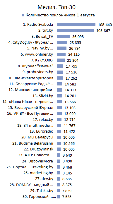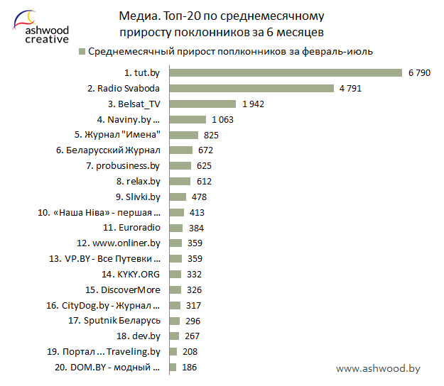 Лидером Топ-20, как и предыдущие три месяца, с большим отрывом стала страница «tut.by». А следом за ней расположилась страница «Naviny.by - Белорусские новости», вытеснив из тройки лидеров «Radio Svoboda». Отметим, что у «Radio Svaboda» всего 725 поклонников, что для нее необычно. Замыкает тройку новичок Топ-20 – страница «The Village Беларусь».