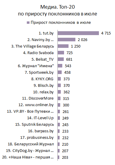МЕДИА. Топ-20 по приросту поклонников за июль