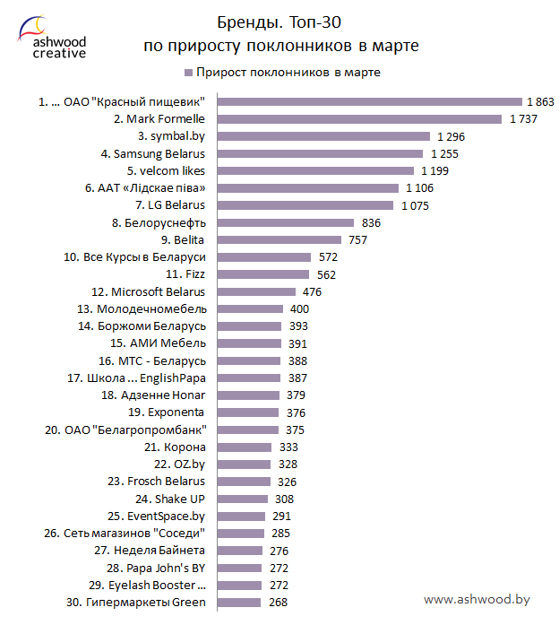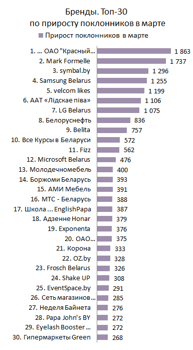 В Топе по приросту за месяц новый лидер — это страница «Кондитерская фабрика ОАО "Красный пищевик"». «Mark Formelle» расположился на втором месте. Лидер предыдущего месяца, страница «symbal.by», спустилась на третью строку. А вот «LG Belarus», который последнее время показывал завидную активность, в этот раз занял только 7-ую позицию, и в марте немного отстает от своего конкурента Samsung Belarus.