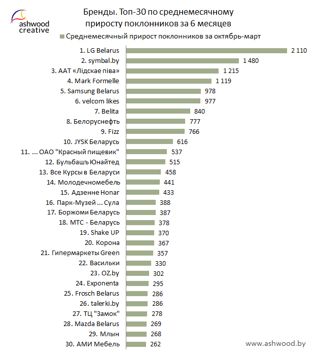 БРЕНДЫ. Топ-30 по приросту поклонников за март