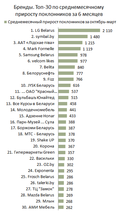 На фоне тройки лидеров результаты остальных страниц кажутся на графике небольшими, но на самом деле они достаточно высокие. Для сравнения, страница «Naviny.by - Белорусские новости», занявшая четвертое место в Медиа набрала в марте больше поклонников, чем лидер по приросту у Брендов.