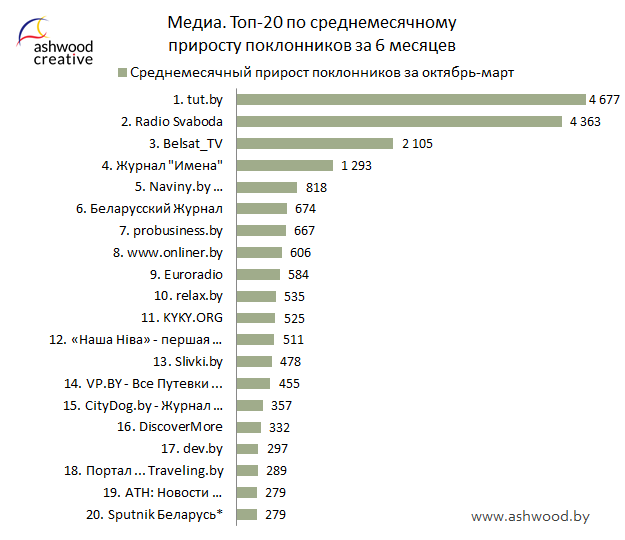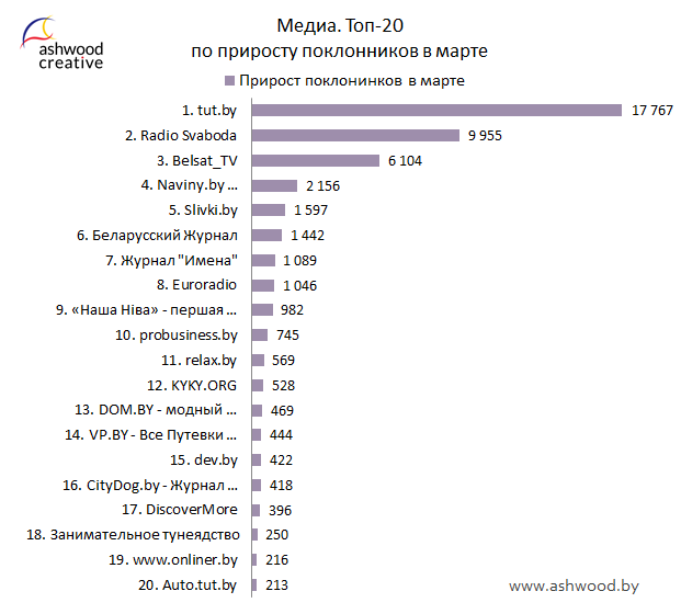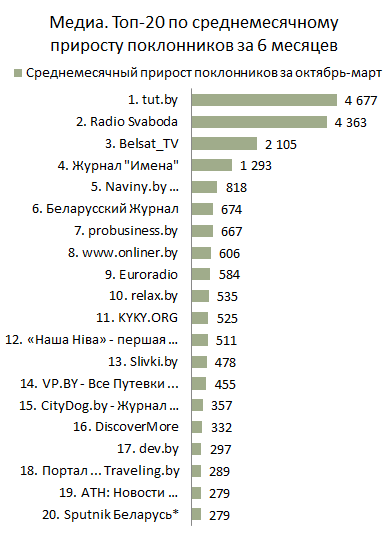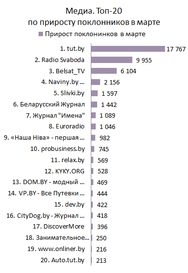 - Март – месяц рекордов среди страниц Медиа. Все участники тройки лидеров Топа по приросту поклонников за месяц побили собственные рекорды. Прирост поклонников страницы «tut.by» за март составил 17 767 (!!!), что более чем в 2 раза больше прошлого рекорда рейтинга. Страницы «Radio Svaboda» и «Belsat_TV», набрав 9 955 и 6 104 поклонников соответственно, также установили собственные рекорды;