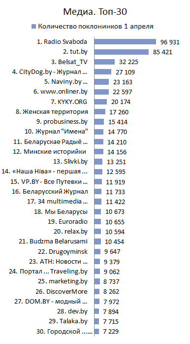 В Топ-30 Медиа по количеству поклонников произошли изменения в тройке лидеров. На третье место переместилась страница «Belsat_TV», сместив на четвертую строчку «CityDog.by - Журнал о Минске», которая держалась в тройке лидеров с января 2016 года. Первое и второе места по-прежнему занимают «Radio Svaboda» и «tut.by», которые быстро увеличивают отрыв от основной группы.