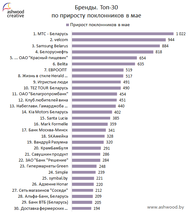 БРЕНДЫ. Топ-30 по приросту поклонников за май