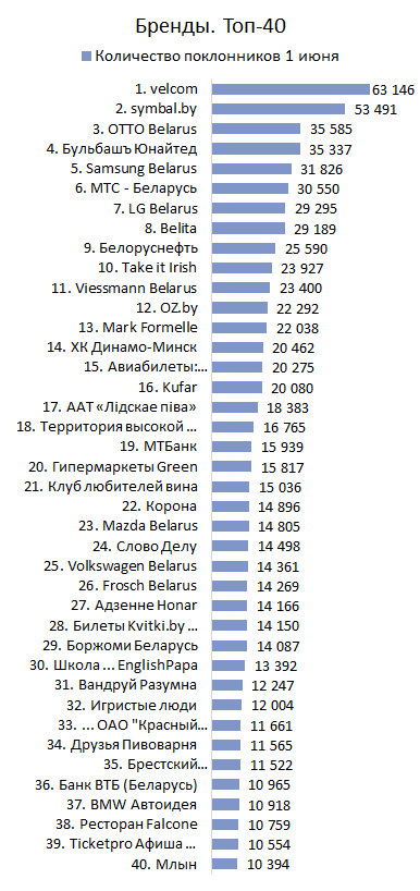 Бессменный лидер среди Брендов, страница «velcom», в мае продолжила увеличивать свой отрыв от «symbal.by». 1 июня разрыв составил 9 655 поклонников. Расположившиеся на 3 и 4 местах, страницы «OTTO Belarus» и «Бульбашъ Юнайтед», очередной месяц теряют поклонников. Это одна из причин, по которым к ним стремительно приближаются преследователи.