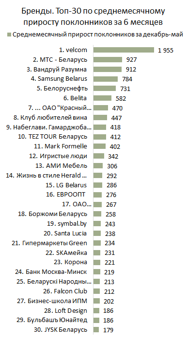 В Топ по среднемесячному приросту поклонников вошли три новые страницы «Бизнес-школа ИПМ», «Loft Design» и «JYSK Беларусь». Страница «velcom» сохраняет первое место, а активность «МТС - Беларусь» в мае, помогла ей подняться на одну строку вверх и занять второе место, сместив «Вандруй Разумна» на третью позицию. Страница «ЕВРООПТ», появившаяся среди участников Топ в апреле, за предыдущий месяц смогла подняться на 14 мест.