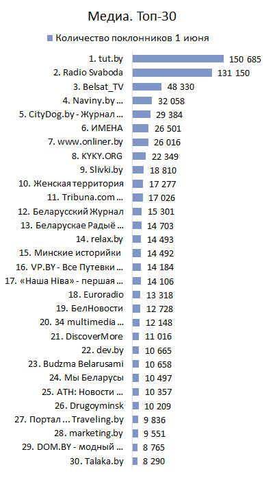 В Топе Медиа значительных изменений не произошло. Страница «tut.by» остается лидером и наращивает свое преимущество над главным конкурентом - «Radio Svaboda». Разница между ними составляет 19 535 поклонников.