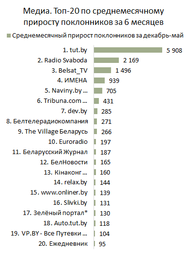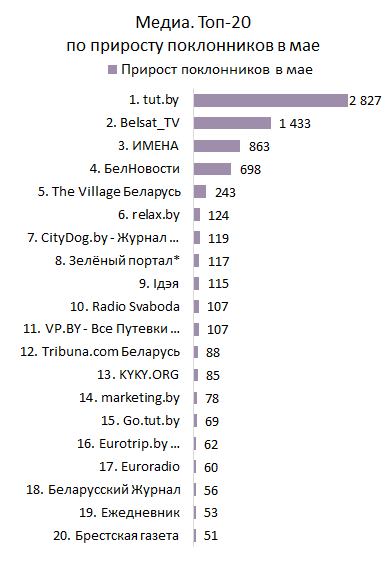 Уже седьмой месяц подряд «tut.by» занимает первое место Топа по приросту за месяц. В мае страница выросла на 2 827 поклонников. На втором месте расположилась «Belsat_TV», а третью строчку заняла страница «ИМЕНА».