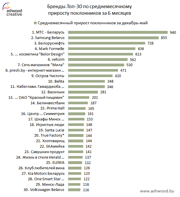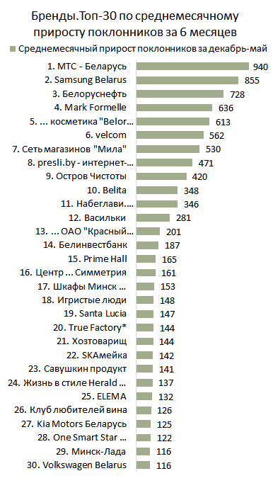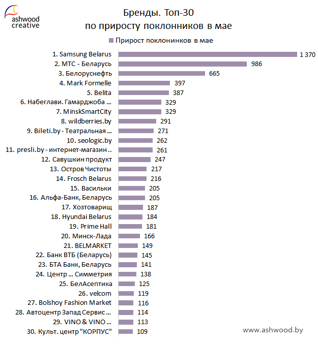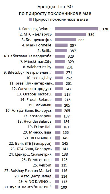 БРЕНДЫ. Топ-30 по приросту поклонников за Май