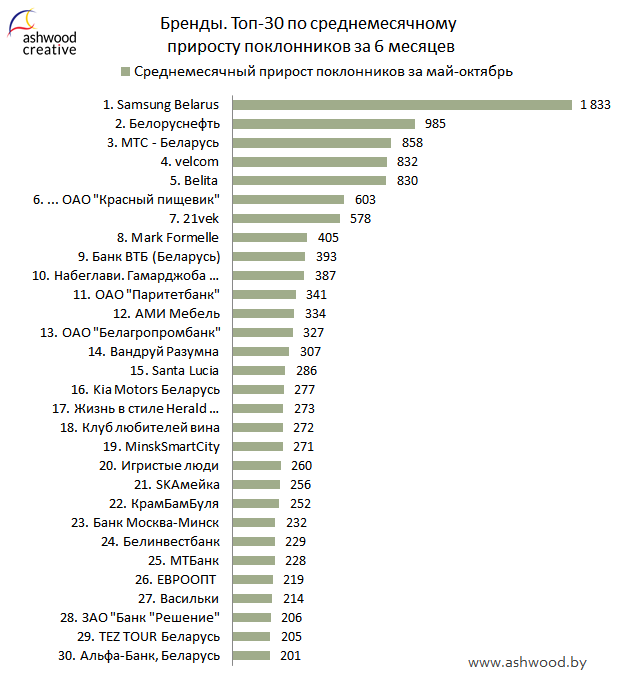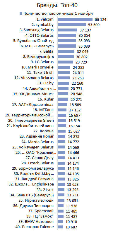 - В Топ-30 по приросту поклонников за полугодие среди Брендов был смещен лидер данного рейтинга последних 6 месяцев — страница «velcom». В октябре ей удалось занять лишь 4 строку списка.