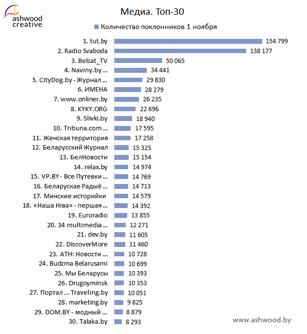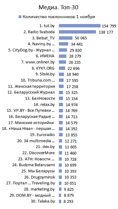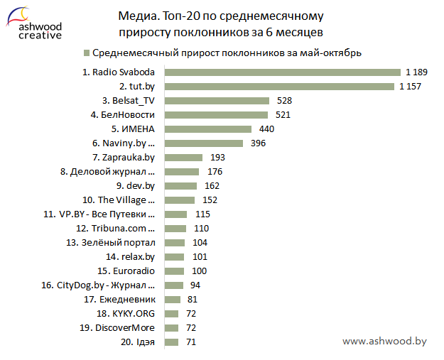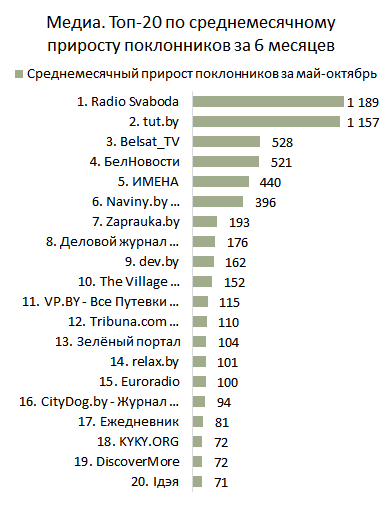 В Топе по среднемесячному приросту поклонников лидеры поменялись местами. На первую строку вышла страница «Radio Svaboda», сместив «tut.by» на вторую. Третье, по-прежнему, осталось за «Belsat_TV». В Топ вошла страница «KYKY.ORG», заняв 18 строчку списка.