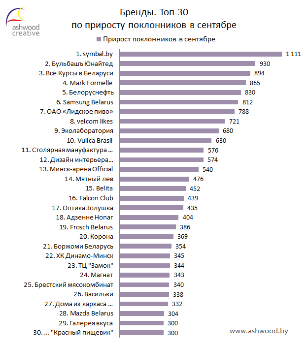 В последние несколько месяцев в Топе наблюдалась тенденция увеличения прироста. Однако суммарный прирост поклонников в Топ-30 в сентябре снизился на 3 730 по сравнению с августом и составил 16 212. Первое место четвертый месяц подряд (!) занимает страница «symbal.by», набравшая в сентябре 1111 поклонников. На втором месте расположился «Бульбашъ Юнайтед», третье, как и в прошлом месяце, заняла страница «Все Курсы в Беларуси».