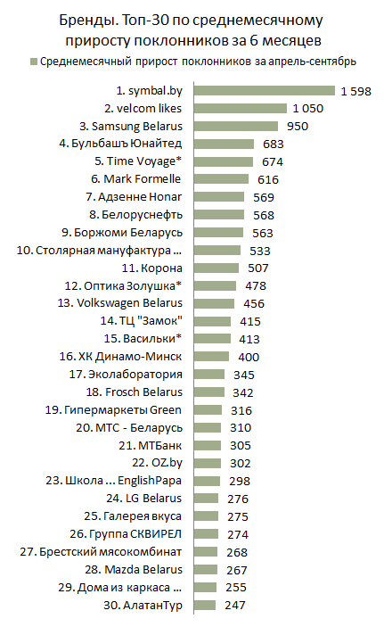 БРЕНДЫ. Топ-30 по приросту поклонников за сентябрь